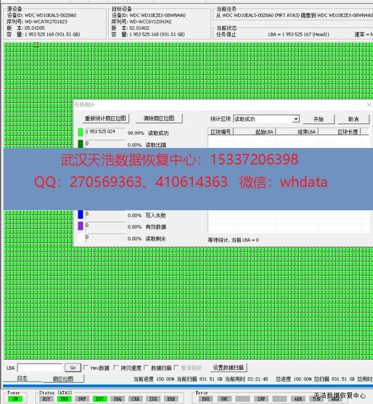 解决方案:收到硬盘后,我们在无尘环境更换兼容的磁头,再接到专业数据恢复工具PC3000 UDMA-E上,通电硬盘正常认盘,DE全盘镜像,成功恢复客户硬盘内几乎全部数据。