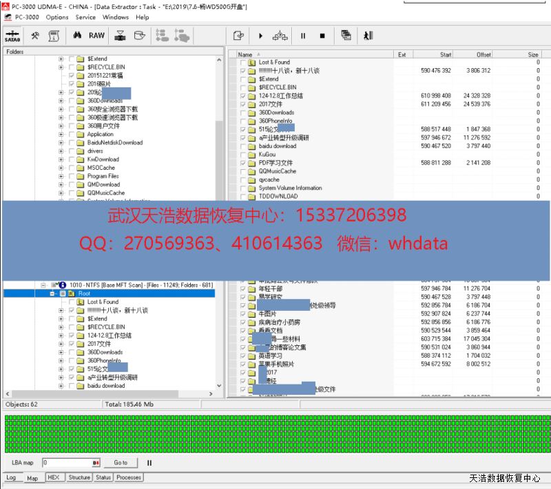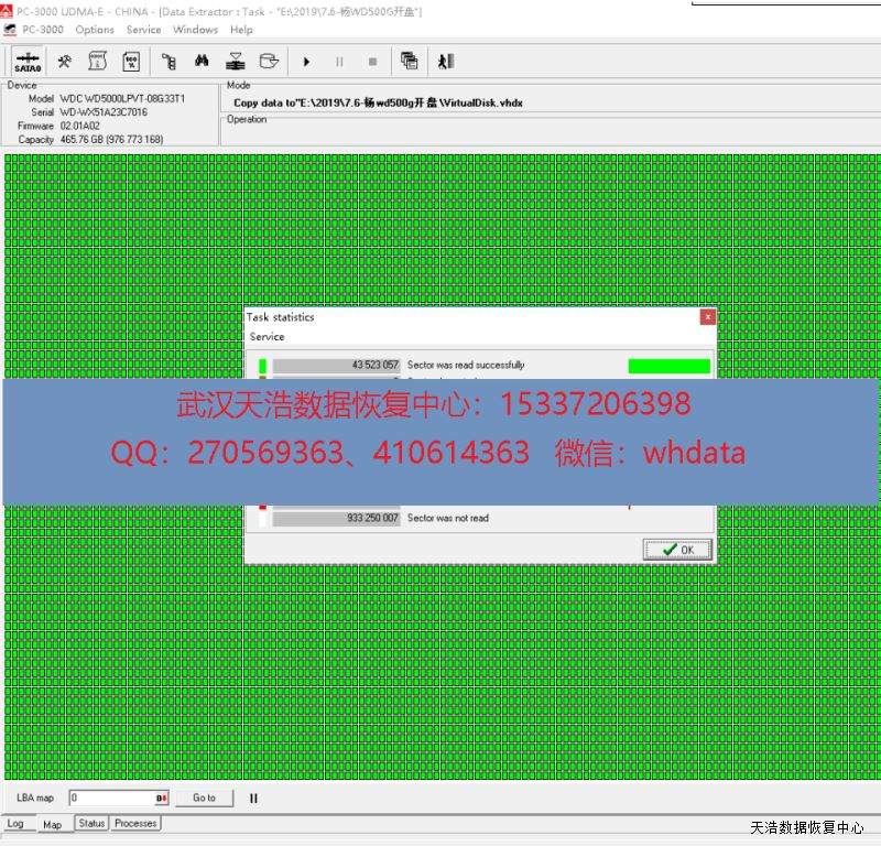 解决方案:收到硬盘后,我们在无尘环境更换兼容的磁头,再接到专业数据恢复工具PC3000 UDMA-E上,通电硬盘正常认盘,DE全盘镜像,成功恢复客户硬盘内几乎全部数据。