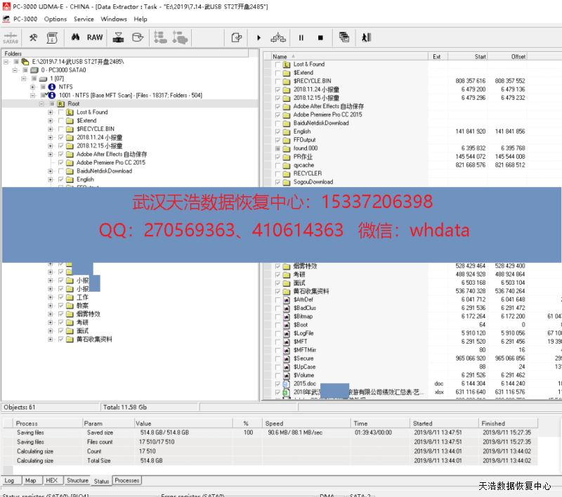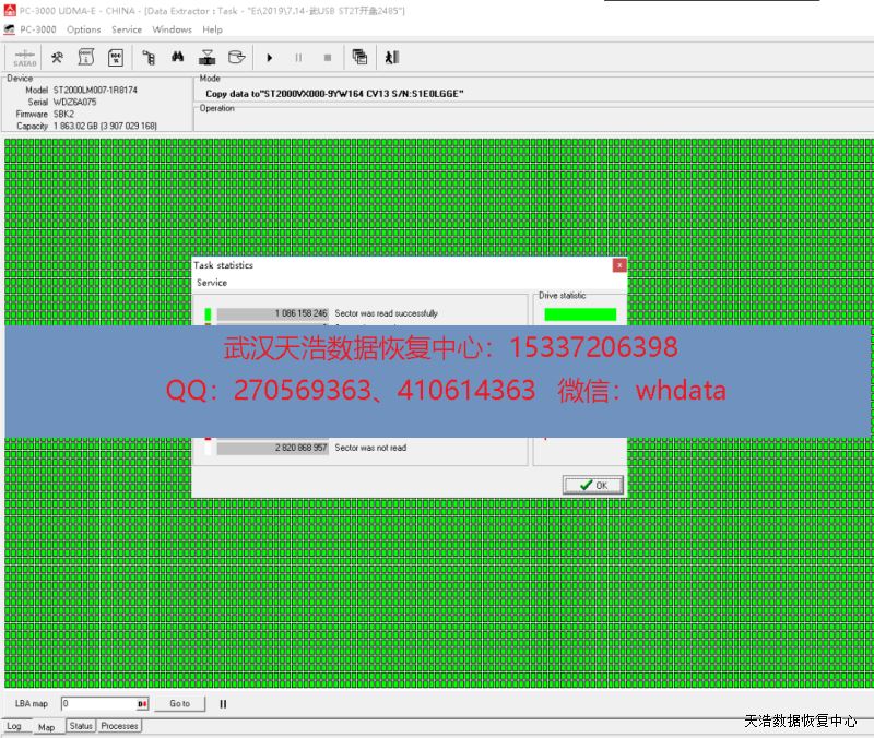 解决方案:收到硬盘后,我们在无尘环境更换兼容的磁头,再接到专业数据恢复工具PC-3000 UDMA Express上,通电,硬盘正常认盘,DE镜像,成功恢复硬盘内将近500G的数据!