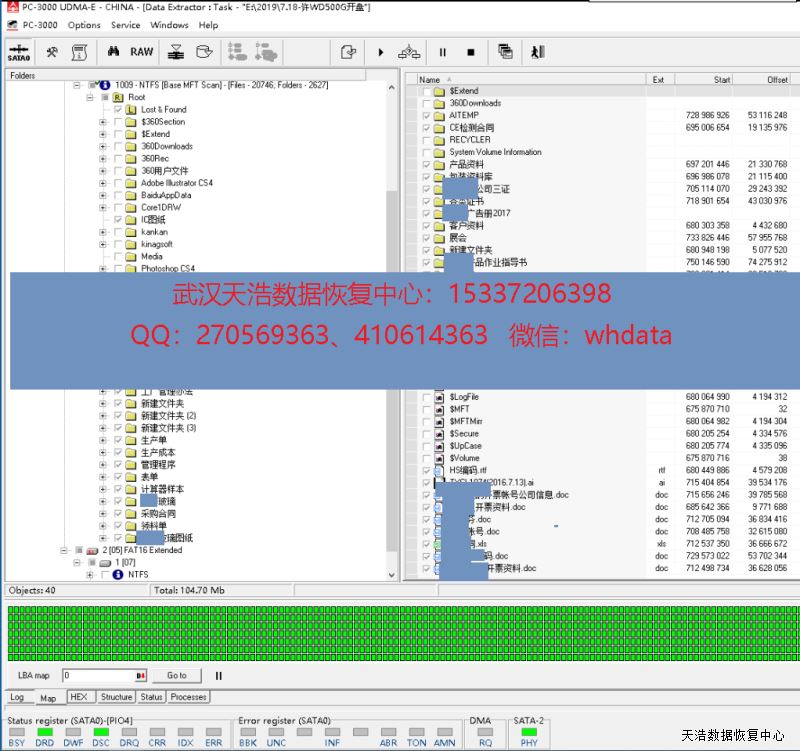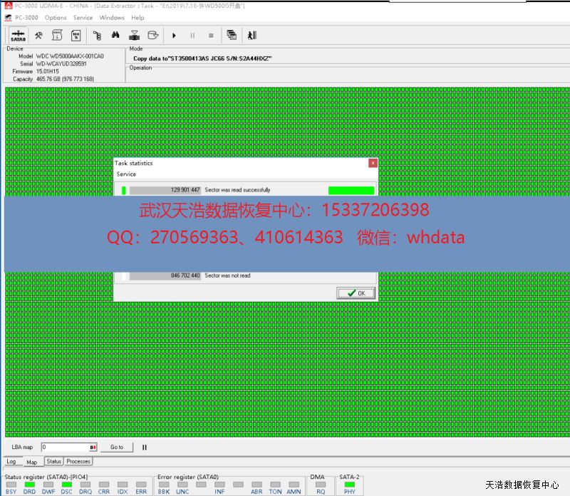 解决方案:收到硬盘后,我们在无尘环境对盘片划伤部位处理后,更换兼容的磁头,再接到专业数据恢复工具PC3000 UDMA-E上,通电硬盘正常认盘,DE镜像,成功恢复客户硬盘内大部分数据。