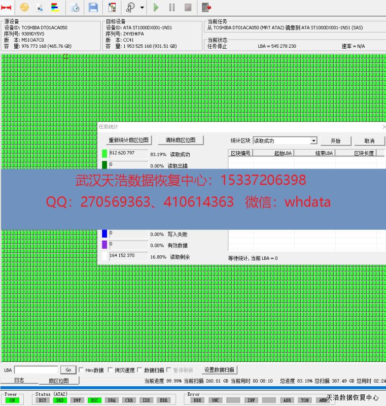 故障现象:东芝500G台式硬盘,全盘坏道。