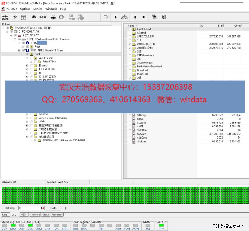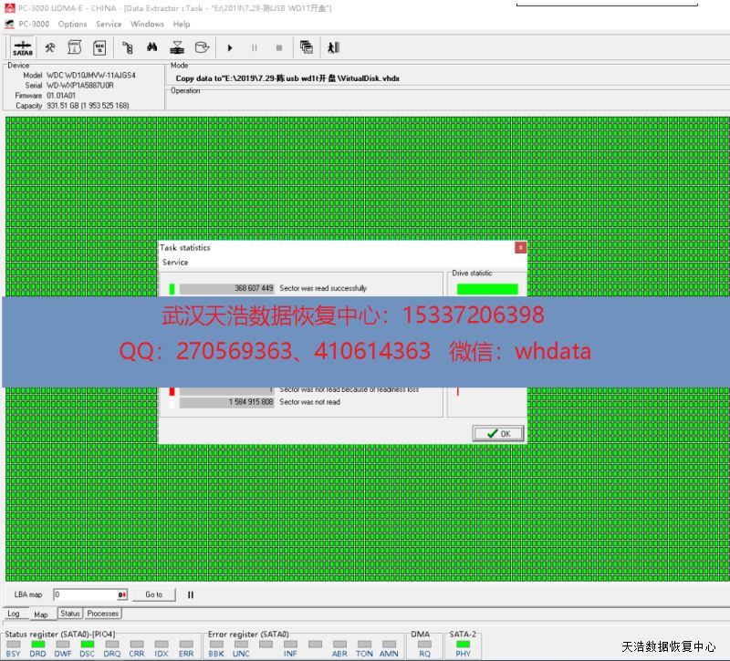 解决方案:收到硬盘后,我们在无尘环境更换兼容的磁头,再接到专业数据恢复工具PC3000 UDMA-E上,通电硬盘正常认盘,DE镜像,成功恢复客户硬盘内几乎全部数据。