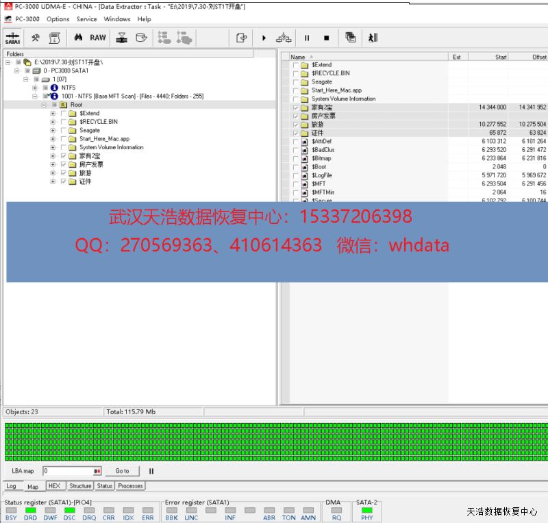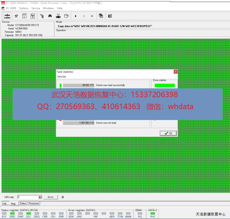 解决方案:收到硬盘后,我们在无尘环境更换兼容的全好磁头,然后接到数据恢复工具PC-3000 UDMA Express上,再通电,硬盘正常认盘,镜像,成功恢复硬盘内大部分数据!