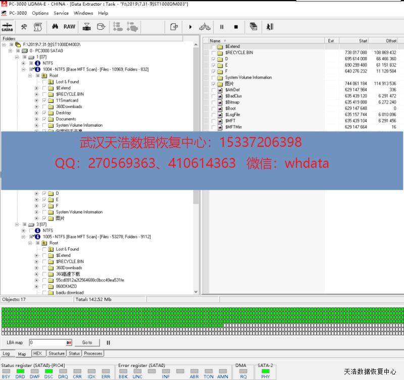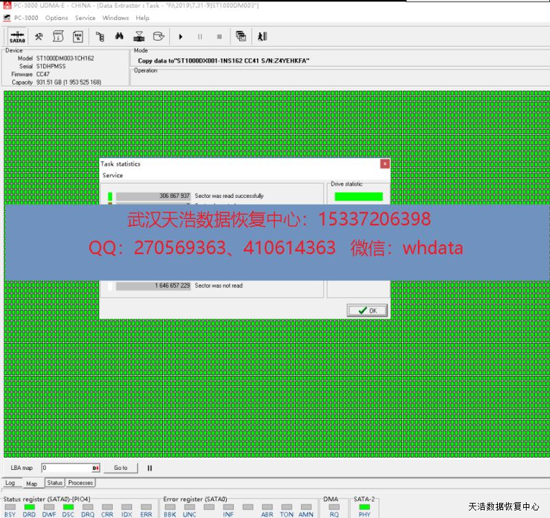 解决方案:收到硬盘后,我们接到数据恢复工具PC-3000 UDMA Express上,检测发现是固件问题,修复固件,断电再通电,硬盘正常认盘,镜像,成功恢复硬盘内大部分数据!