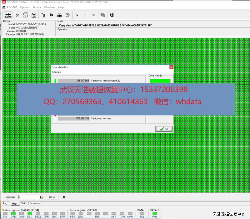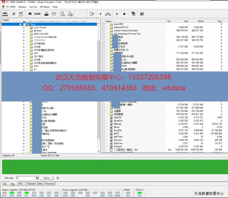 解决方案:收到硬盘后,我们在无尘环境更换兼容的磁头,再接到专业数据恢复工具PC3000 UDMA-E上,通电硬盘正常认盘,DE镜像,成功恢复客户硬盘内几乎全部数据。