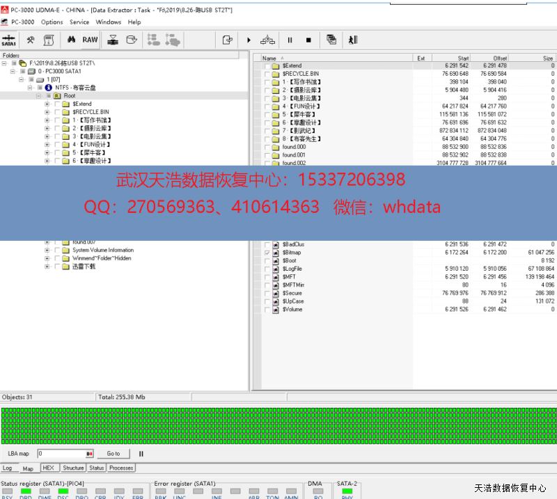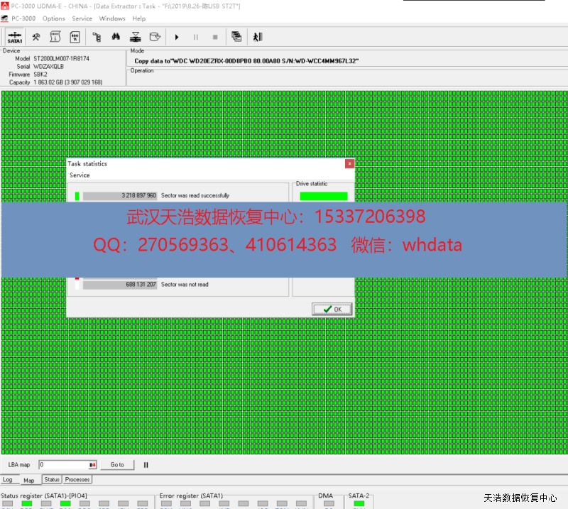 解决方案:收到硬盘后,接到数据恢复工具PC-3000 UDMA Express上,通电检测修复固件问题,断电再通电,硬盘数据区前后都能正常访问,镜像,成功恢复硬盘内大部分数据!