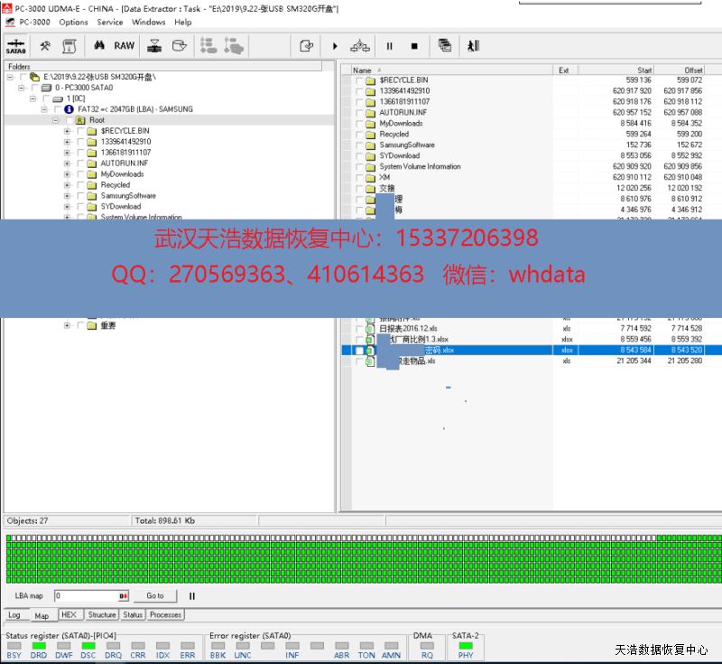 解决方案:收到硬盘后,我们在无尘环境更换兼容的磁头,更换兼容的SATA电路板,再接到数据恢复工具PC-3000 UDMA Express上,硬盘正常认盘,DE分头镜像,成功恢复硬盘内客户几乎全部数据!