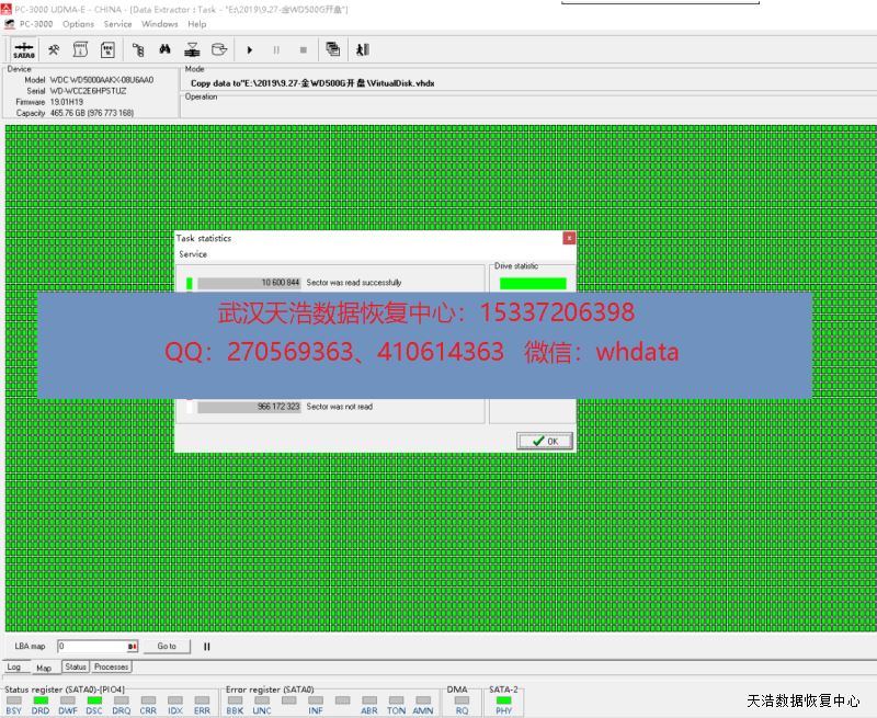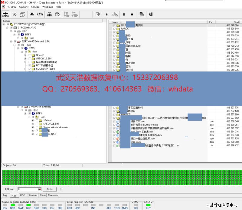 解决方案:收到硬盘后,我们在无尘环境更换兼容的磁头,再接到专业数据恢复工具PC3000 UDMA-E上,通电硬盘正常认盘,DE镜像,成功恢复客户硬盘内大部分数据。