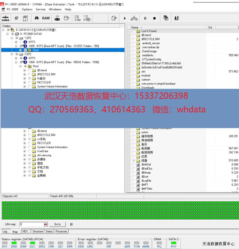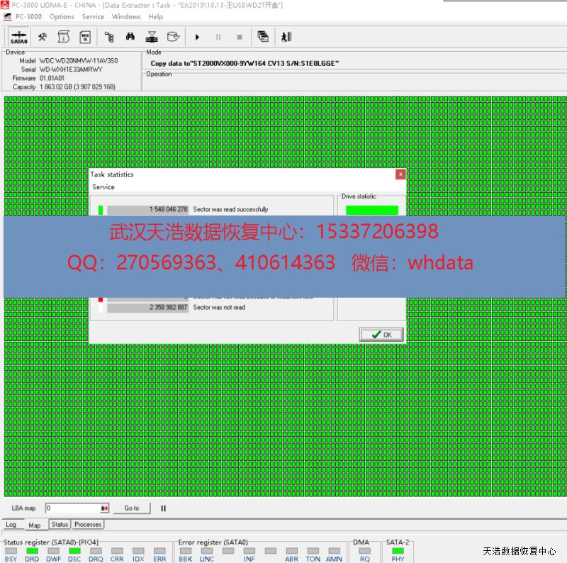 解决方案:收到硬盘后,我们在无尘环境更换兼容的磁头,再接到专业数据恢复工具PC3000 UDMA上,通电硬盘正常认盘,DE镜像,成功恢复客户硬盘内几乎全部数据。