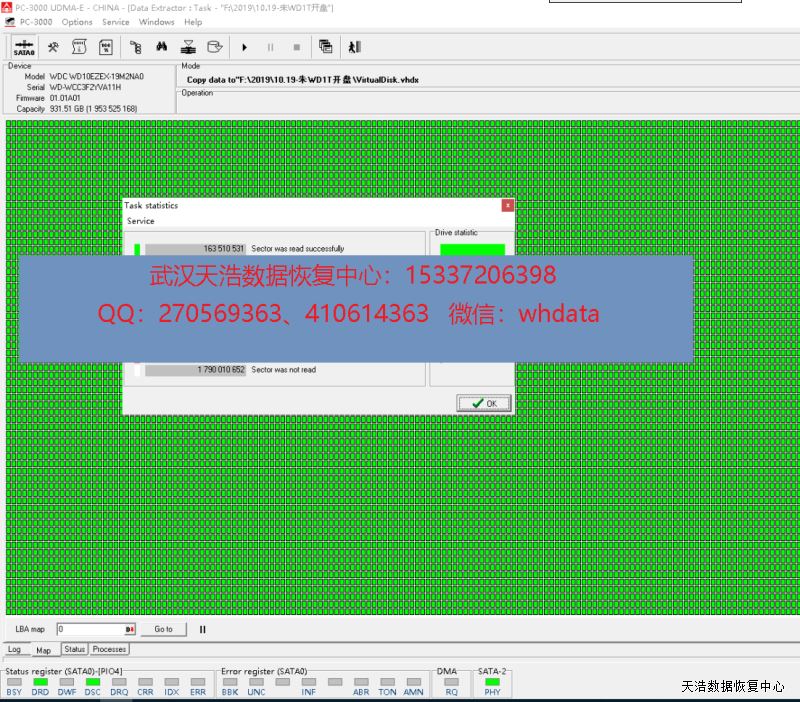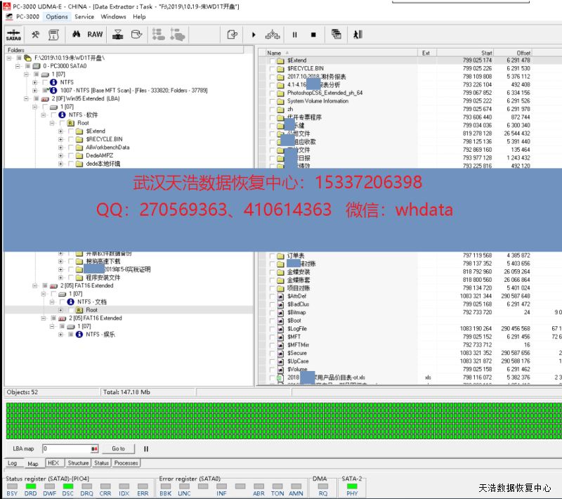 解决方案:收到硬盘后,我们在无尘环境更换兼容的磁头,再接到专业数据恢复工具PC3000 UDMA上,通电硬盘正常认盘,DE镜像,成功恢复客户硬盘内几乎全部数据。包含客户公司的金碟帐套,经验证都OK。