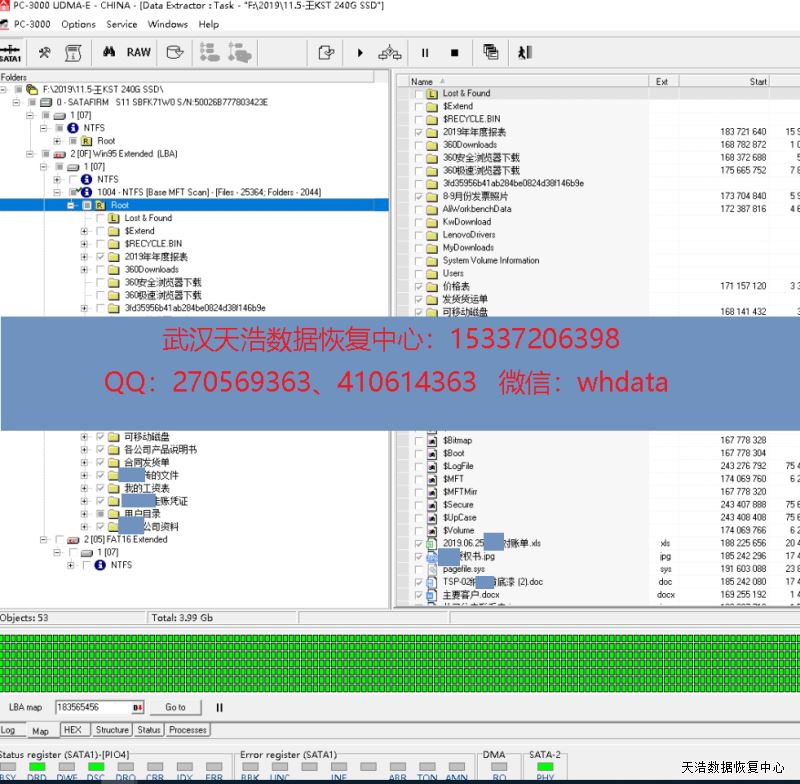 解决方案:收到硬盘后,检测硬盘正常认盘,但型号变成SATAFIRM S11,容量显示正常,但用工具检测发现全盘底层都是00(编译器没有正常加载)。我们使用专业的SSD恢复工具ACE PC3000 SSD,虚拟重建编译器,用PC3000 DE虚拟镜像,成功恢复硬盘内绝大部分数据。