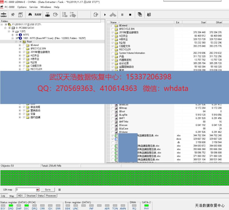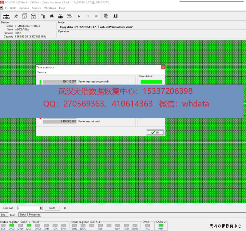 解决方案:收到硬盘后,我们在无尘环境更换兼容的磁头,再接到数据恢复工具PC-3000 UDMA Express上,通电,硬盘数据区前后都能正常访问,镜像,成功恢复硬盘内大部分数据!