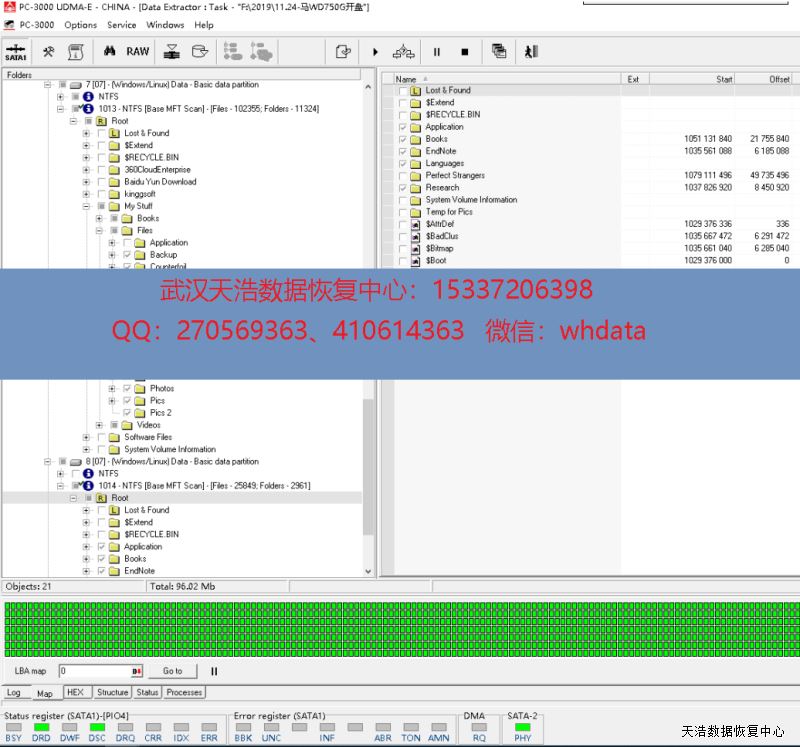 解决方案:收到硬盘后,我们在无尘环境更换兼容的磁头,再接到专业数据恢复工具PC3000 UDMA EXPRESS上,通电硬盘正常认盘,DE镜像,成功恢复客户硬盘内几乎全部数据。