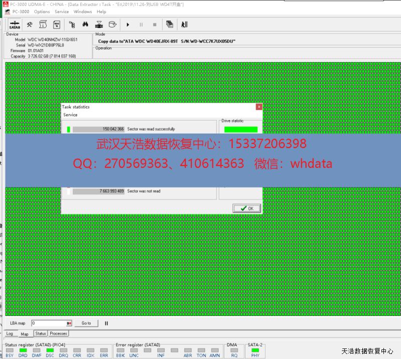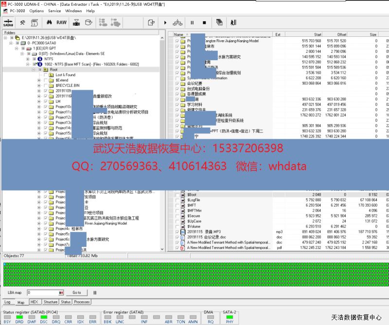 解决方案:收到硬盘后,我们在无尘环境更换匹配的磁头,再接到专业数据恢复工具PC3000 UDMA EXPRESS上,通电硬盘正常认盘,DE成功看到分区和文件目录,镜像,成功恢复硬盘里面客户公司的几乎全部资料!
