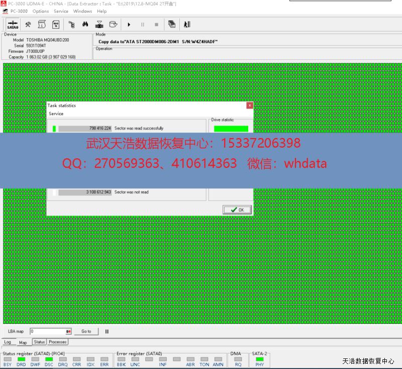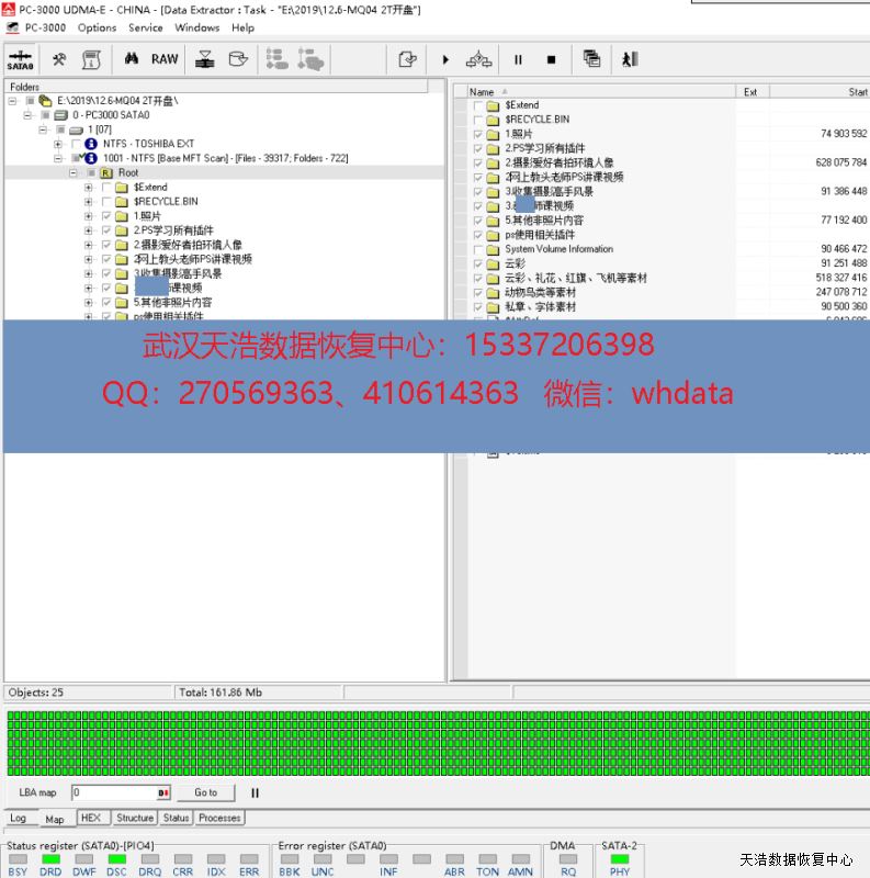 解决方案:收到硬盘后,我们在无尘环境更换兼容的磁头,再接到专业数据恢复工具PC3000 UDMA EXPRESS上,通电硬盘正常认盘,DE镜像,成功恢复客户硬盘内大部分数据。