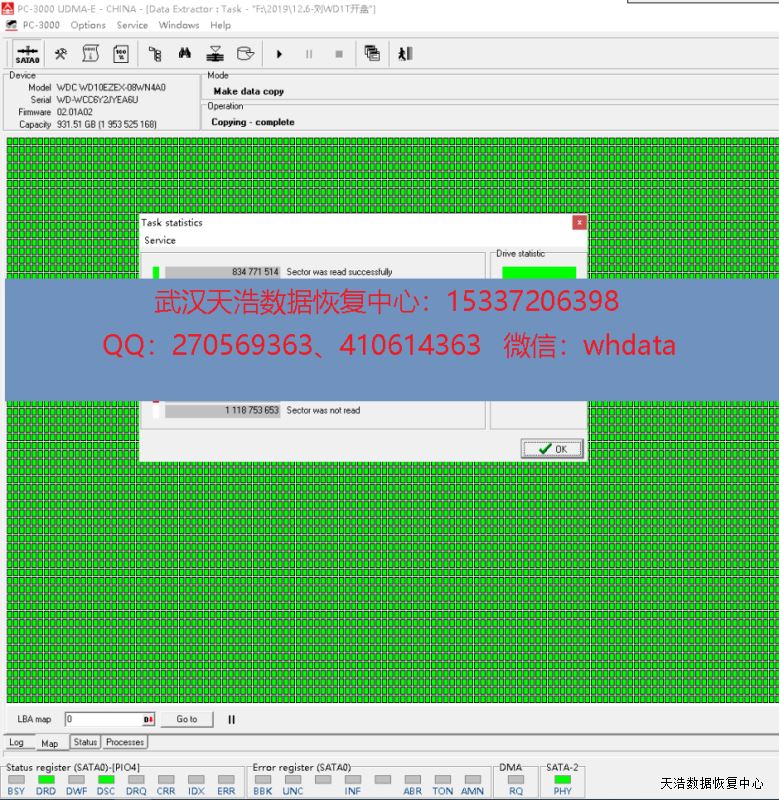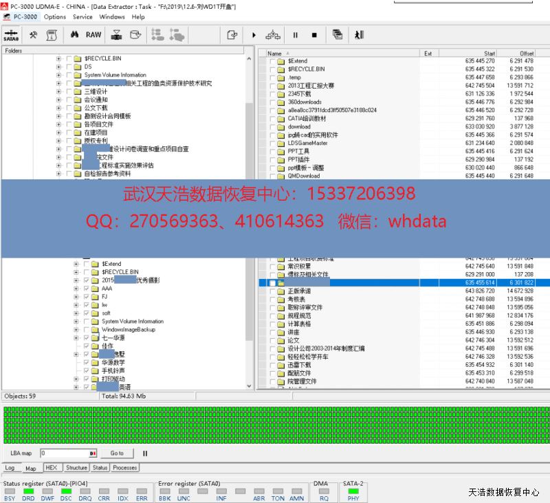 解决方案:收到硬盘后,我们在无尘环境更换兼容的磁头,再接到专业数据恢复工具PC3000 UDMA-E上,通电硬盘正常认盘,DE镜像,成功恢复硬盘内客户公司几乎全部重要资料。