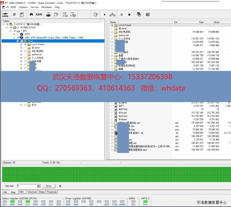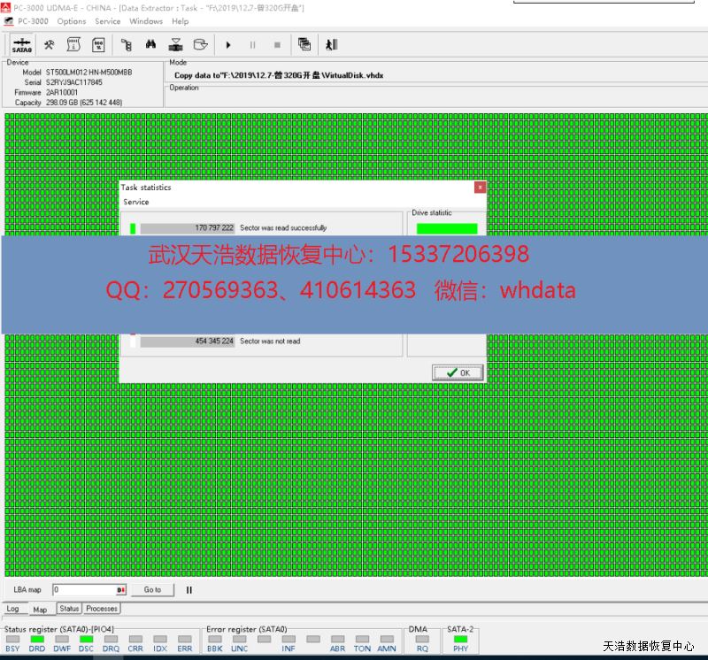 解决方案:收到硬盘后,我们在无尘环境更换兼容的磁头,再接到专业数据恢复工具PC-3000 UDMA Express上,通电硬盘正常认盘,但型号、容量、SN均与盘标不一致,数据区也不能访问,咨询客户,说是之前到另一家数据恢复公司去过,后来因为报价太高就拿到我这边来了,分析固件,再从备份区域找出关键模块,再写入0头,断电通电,数据区终于可以正常访问了,DE分头镜像,成功恢复硬盘内几乎全部数据!