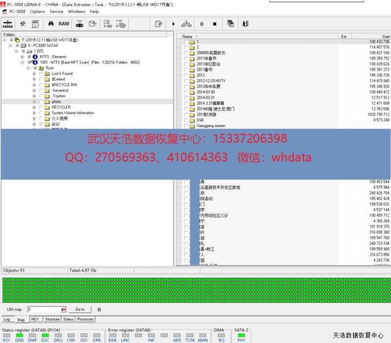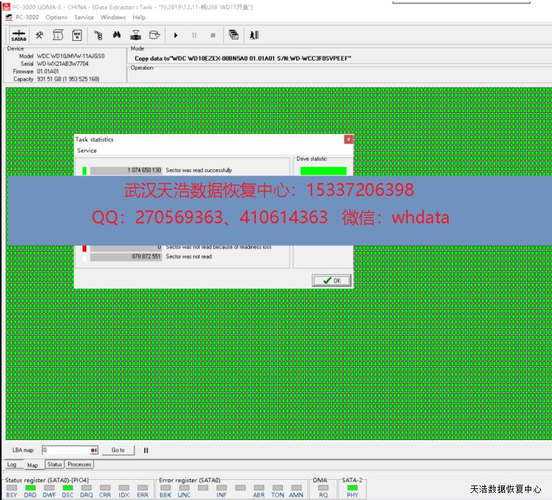 解决方案:收到硬盘后,我们在无尘环境更换兼容的磁头,再接到专业数据恢复工具PC3000 UDMA上,通电硬盘正常认盘,DE镜像,成功恢复客户硬盘内几乎全部数据。