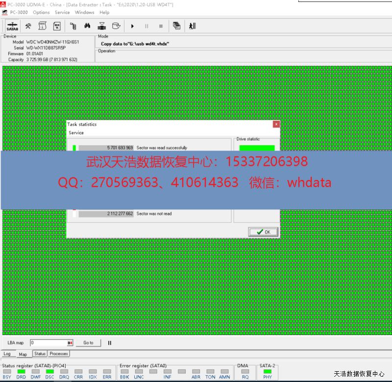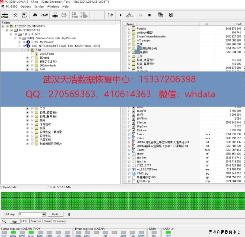 解决方案:收到硬盘后,我们更换兼容的SATA电路板,接到专业数据恢复工具PC3000 UDMA EXPRESS上,通电检测修复固件后,再断电通电,硬盘正常认盘,DE成功看到分区和文件目录,镜像,成功恢复硬盘里面客户公司的几乎全部资料!