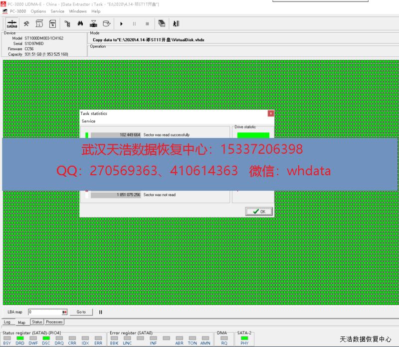 解决方案:收到硬盘后,接到专业的数据恢复工具PC3000 UDMA EXPRESS上检测,发现是1个磁头损坏,我们在无尘柜内拆开,更换兼容的磁头,通电硬盘正常认盘,DE镜像,成功恢复硬盘内客户公司的几乎全部数据!