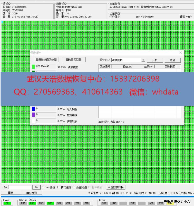 解决方案:收到硬盘后,我们在无尘柜内拆开,更换兼容的磁头,再接到专业的数据恢复工具PC3000 UDMA EXPRESS上,通电硬盘正常认盘,DE镜像,成功恢复硬盘内客户公司的几乎全部数据!