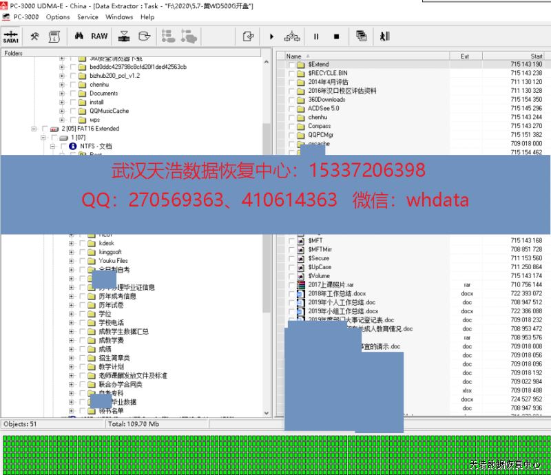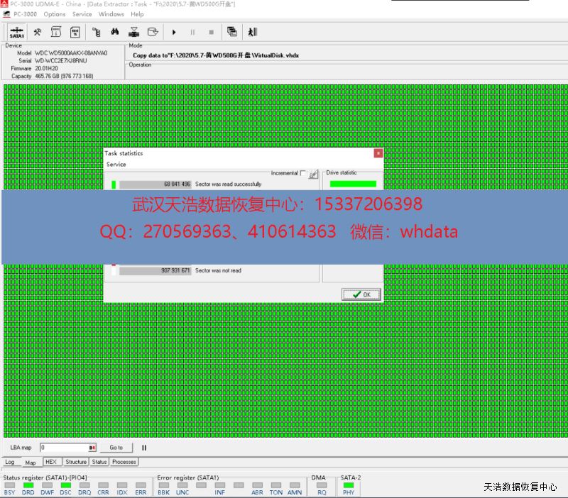 解决方案:收到硬盘后,我们在无尘环境更换兼容的磁头,再接到专业数据恢复工具PC3000 UDMA-E上,通电硬盘正常认盘,DE镜像,成功恢复客户硬盘内几乎全部数据。
