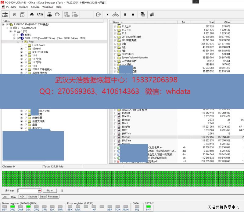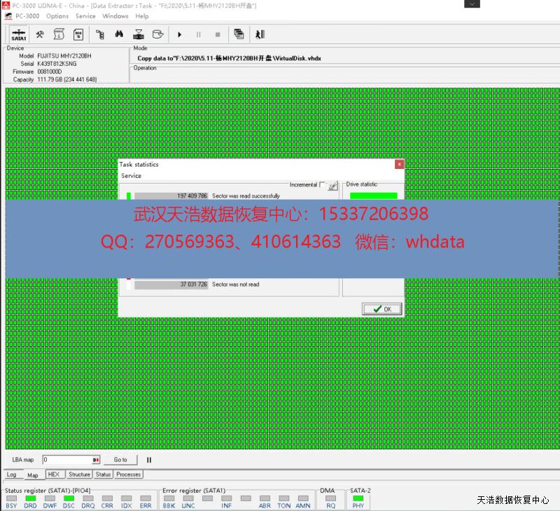 解决方案:收到硬盘后,从我们的备件库找到匹配的备件,在无尘柜里面更换磁头,再接到数据恢复工具PC-3000 UDMA Express上,通电硬盘认盘,镜像,成功恢复客户硬盘内几乎全部重要资料!