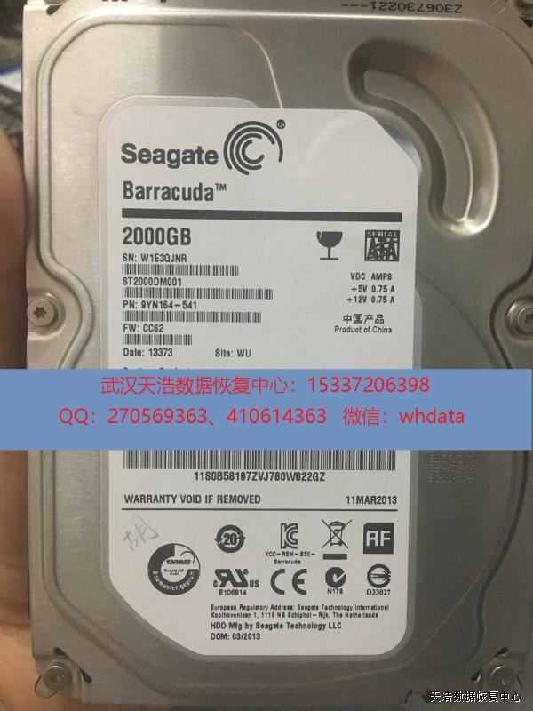 硬盘型号:ST2000DM001-9YN164 SN:W1E3QJNR FW:CC62 电路板号:100664987