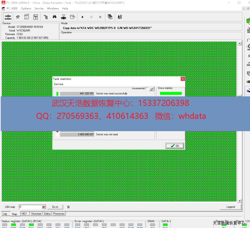 解决方案:收到硬盘后,我们在无尘柜内拆开,检测盘片,发现有一个面有轻伤,清洗盘片处理划伤问题后,更换兼容的磁头,接到专业的数据恢复工具PC3000 UDMA EXPRESS上检测通电硬盘正常认盘,DE镜像,成功恢复硬盘内客户公司的绝大多数数据!