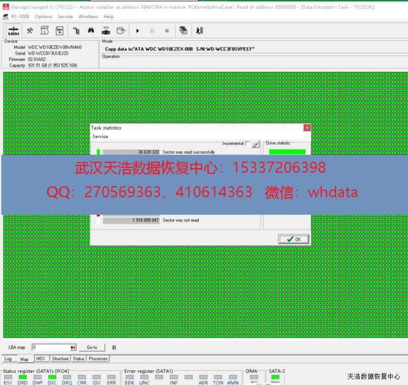 解决方案:收到硬盘后,我们发现硬盘到处都是泥巴,清理过后,在无尘柜里面拆开,发现盘腔里面都是水,清洗盘片,更换盘片到干净盘腔,再更换兼容的磁头,再接到专业数据恢复工具PC3000 UDMA-E上,通电硬盘正常认盘,DE镜像,成功恢复客户硬盘内几乎全部数据,包含客户要的数据库,经验证也ok。