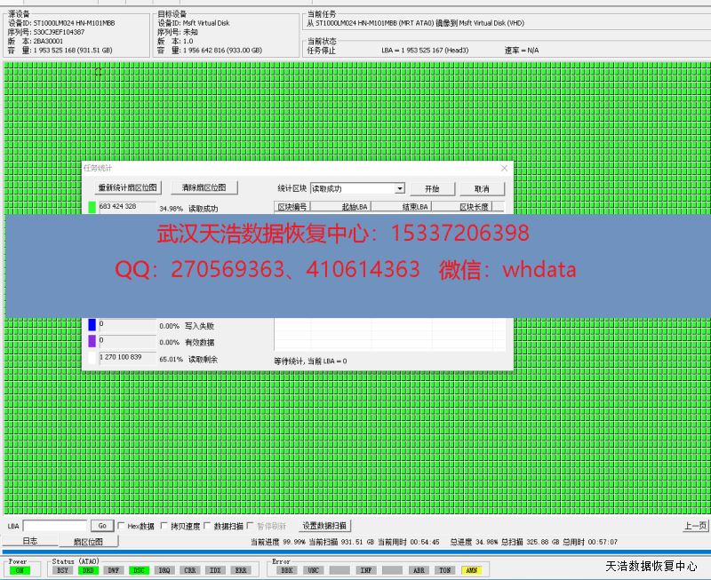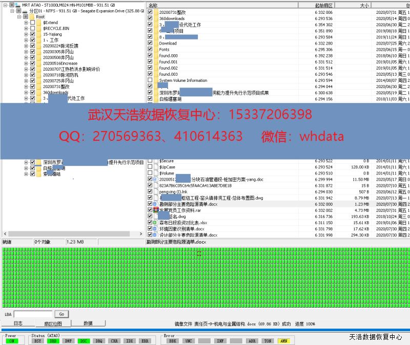 解决方案:收到硬盘后,我们在无尘环境更换兼容的磁头,再接到专业数据恢复工具PC-3000 UDMA Express上,通电硬盘正常认盘,DE分头镜像,成功恢复硬盘内几乎全部数据!