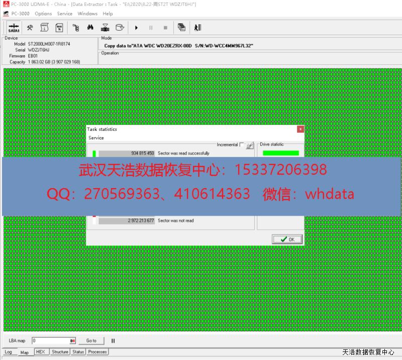 硬盘就绪后,读ID就报DWF错误,这是希捷这种盘的常见故障,修复固件问题后,断电通电硬盘正常认盘,镜像,成功恢复硬盘内几乎全部数据!