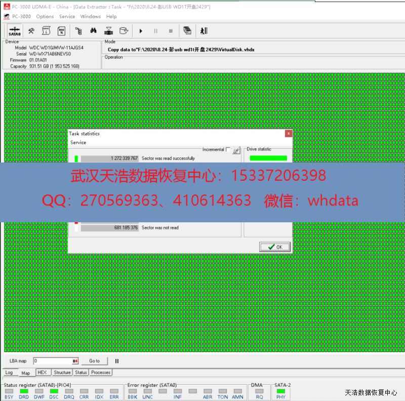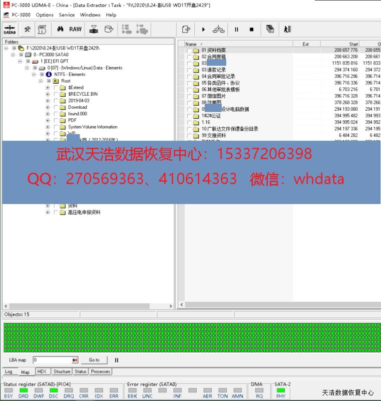 解决方案:收到硬盘后,我们在无尘环境更换兼容磁头,更换兼容的SATA电路板,接到专业数据恢复工具PC3000 UDMA EXPRESS上,通电硬盘正常认盘,DE镜像,成功恢复客户硬盘内几乎全部数据。