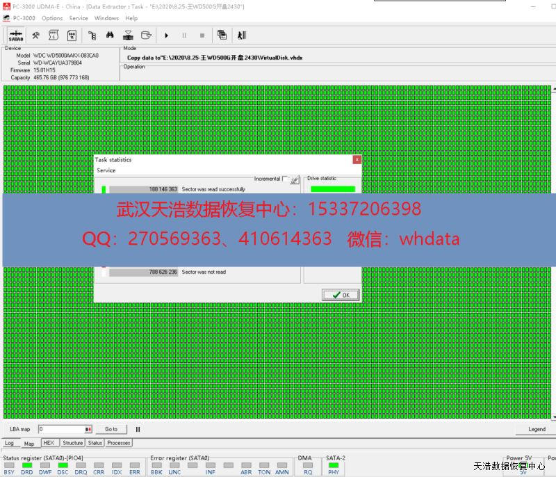 解决方案:收到硬盘后,我们在无尘环境更换兼容的磁头,再接到专业数据恢复工具上,通电正常认盘,DE镜像,成功恢复客户硬盘内大部分数据。