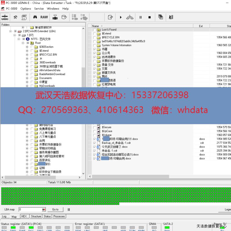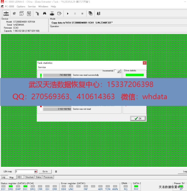 解决方案:收到硬盘后,我们在无尘环境更换兼容磁头,再接到数据恢复工具PC-3000 UDMA Express上,通电,硬盘正常认盘,DE镜像,成功恢复客户硬盘内的大部分数据。