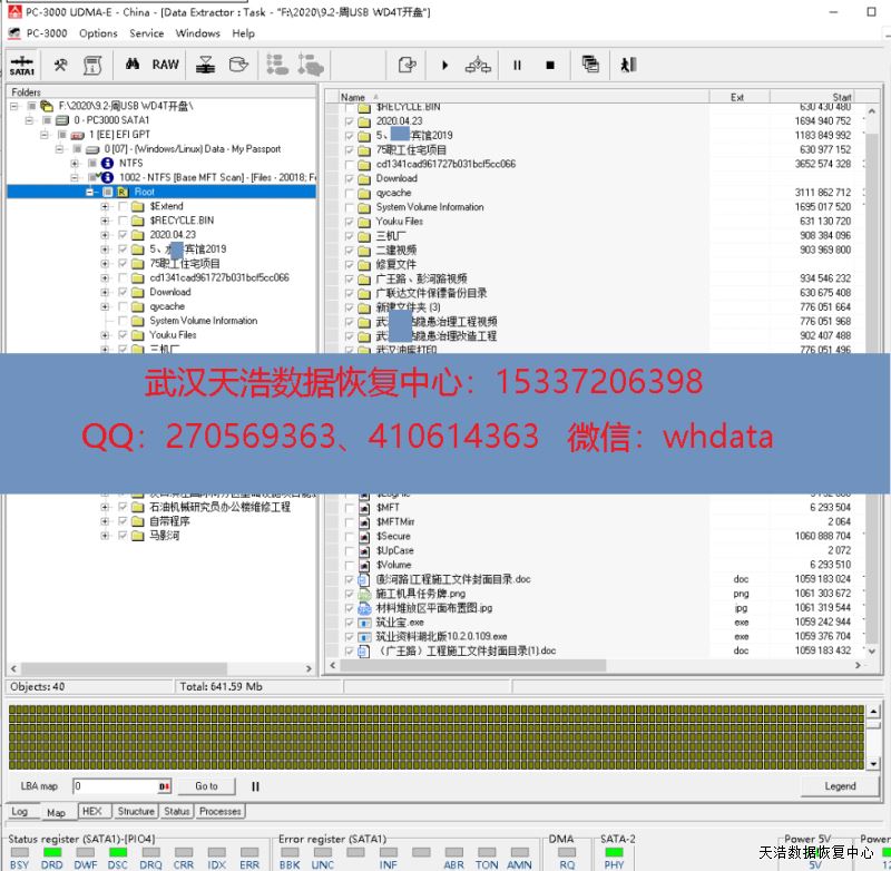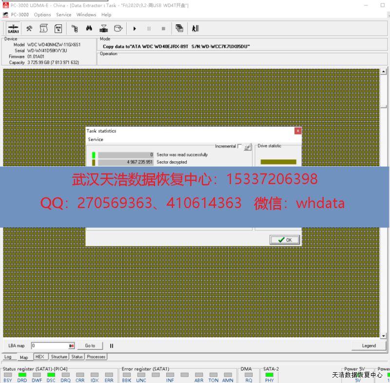 解决方案:收到硬盘后,我们在无尘环境拆开硬盘,更换兼容的磁头,更换兼容的SATA电路板,再接到专业数据恢复工具PC3000 UDMA EXPRESS上,通电硬盘正常认盘,DE解密镜像,成功恢复硬盘内大部分数据。