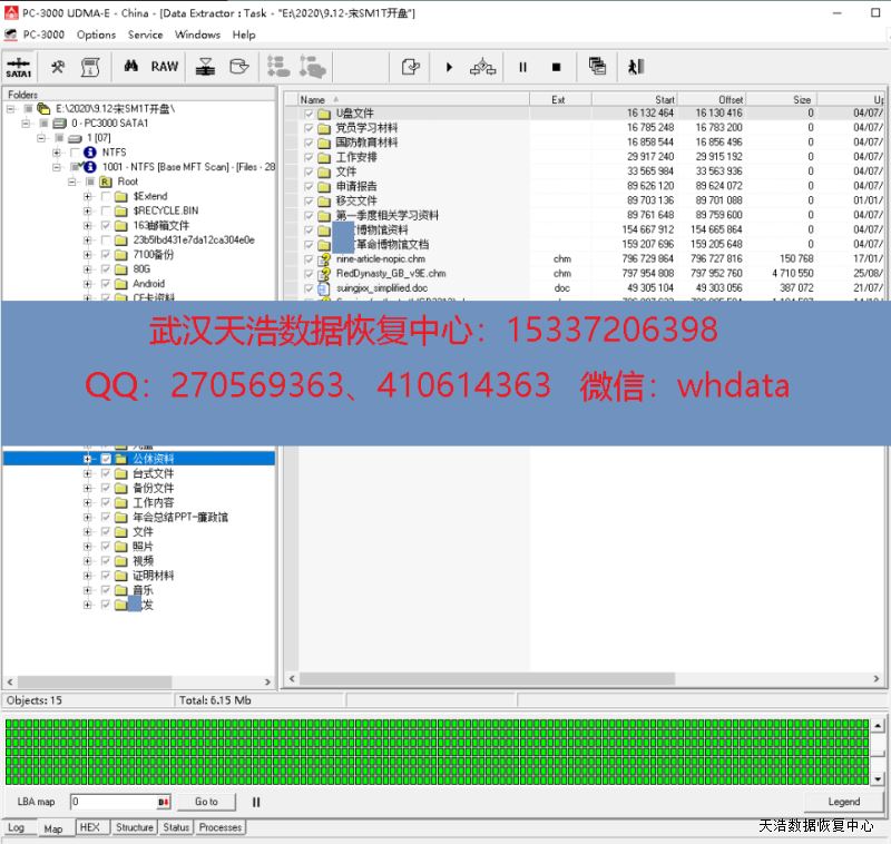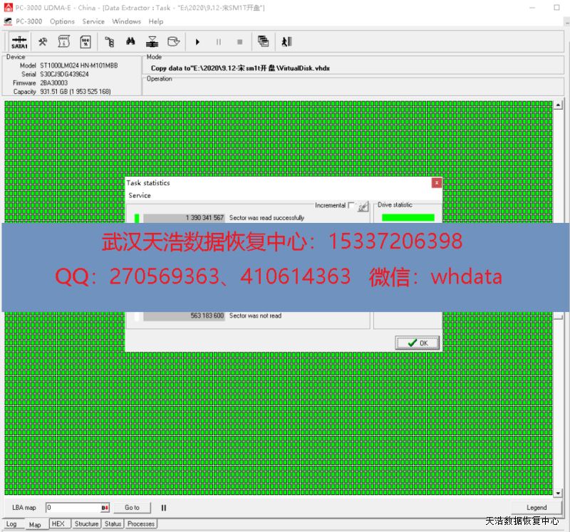 解决方案:收到硬盘后,我们在无尘环境更换兼容的磁头,再接到专业数据恢复工具PC-3000 UDMA Express上,通电硬盘正常认盘,DE分头镜像,成功恢复硬盘内几乎数据!