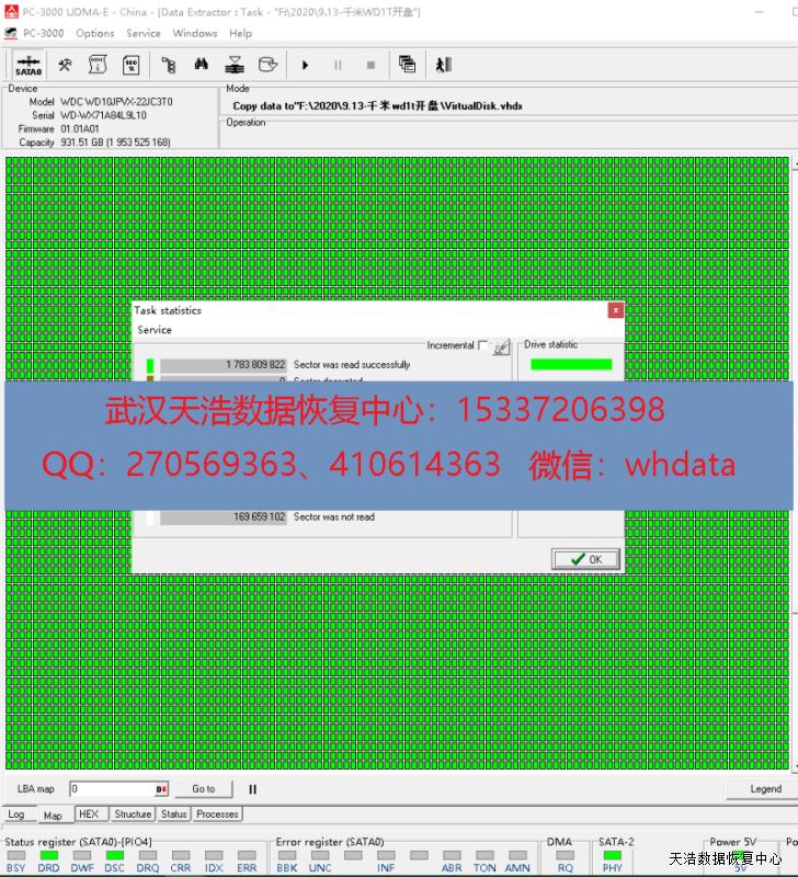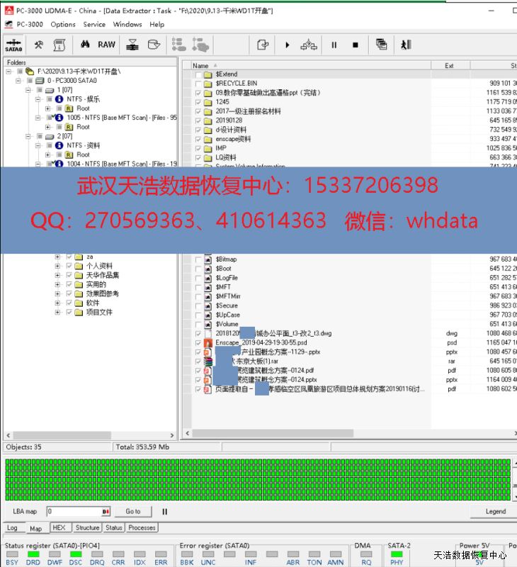 解决方案:收到硬盘后,我们在无尘环境更换兼容磁头,接到专业数据恢复工具PC3000 UDMA EXPRESS上,通电硬盘正常认盘,DE镜像,成功恢复客户硬盘内的几百G数据!