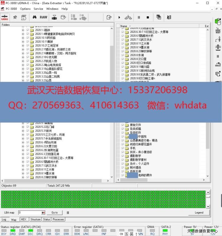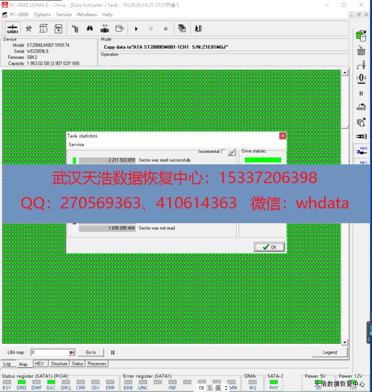 解决方案:收到硬盘后,我们在无尘环境更换兼容的磁头,再接到数据恢复工具PC-3000 UDMA Express上,通电,硬盘正常认盘,镜像,成功恢复硬盘内大部分照片数据!