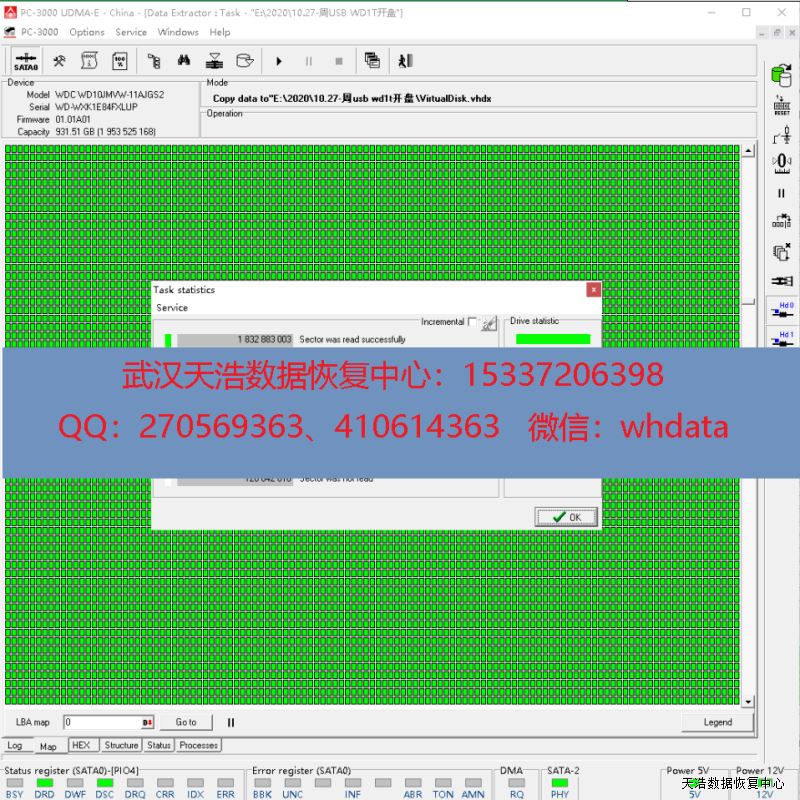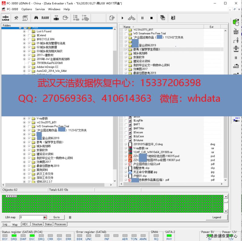 解决方案:收到硬盘后,我们在无尘环境更换兼容磁头,更换兼容的SATA电路板,接到专业数据恢复工具PC3000 UDMA EXPRESS上,通电硬盘正常认盘,DE镜像,成功恢复客户硬盘内大部分数据!