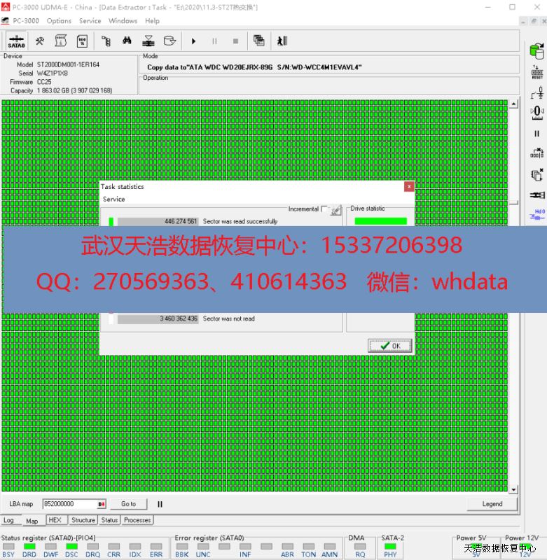 解决方案:收到硬盘后,接到数据恢复工具PC-3000 UDMA Express上,通电,读出原始ROM,再通过希捷F3热交换技术处理后,DE镜像,由于0扇区在划伤的面上,手工找出客户需要恢复的分区,整个分区镜像,成功恢复大部分数据。