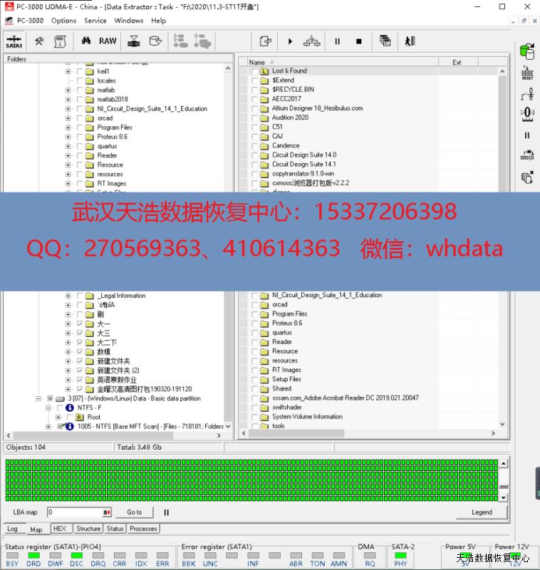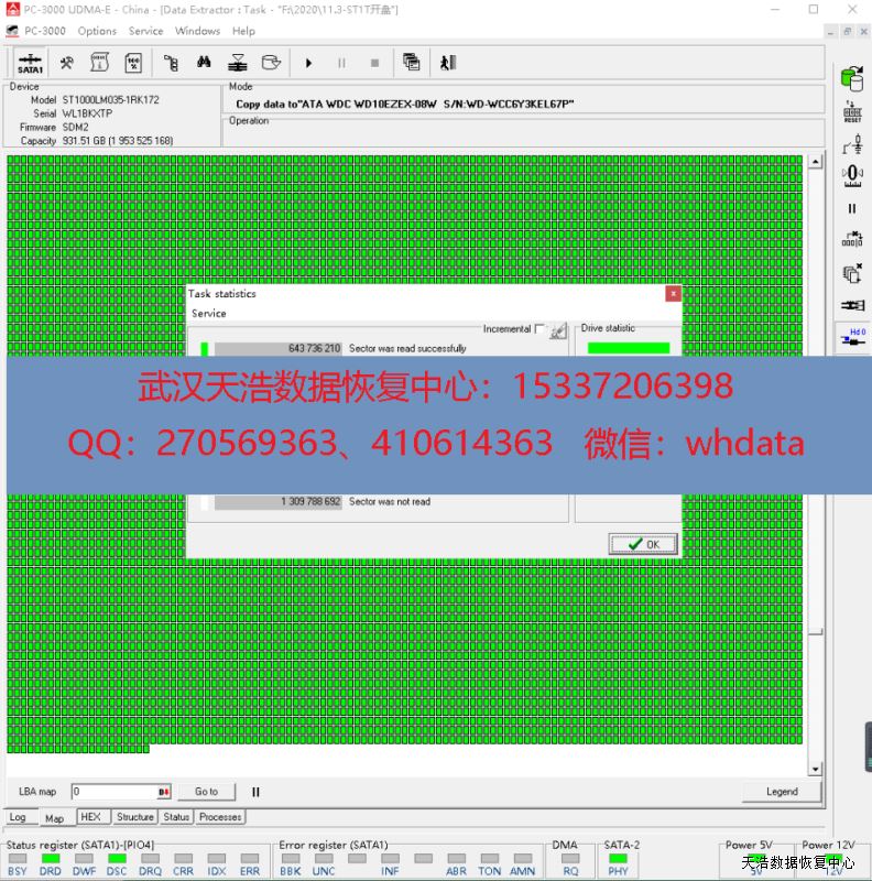 解决方案:收到硬盘后,我们在无尘环境更换兼容的磁头,再接到专业数据恢复工具PC-3000 UDMA Express上,通电硬盘正常认盘,DE分头镜像,成功恢复硬盘内大部分数据!