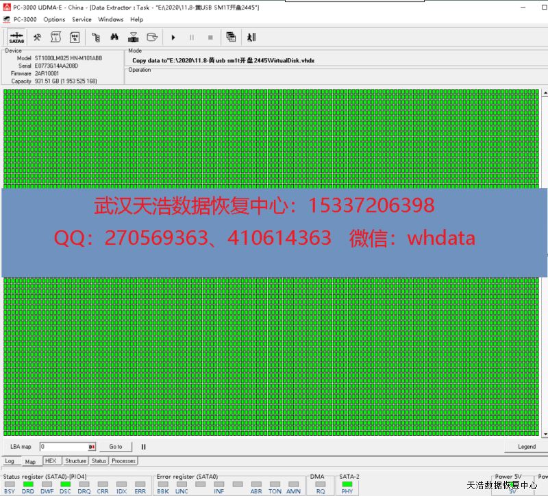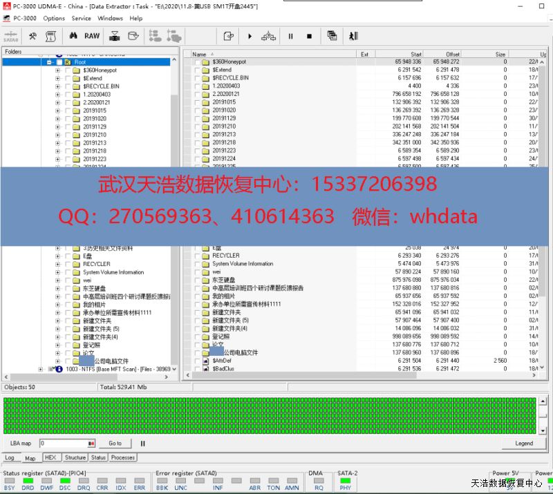 解决方案:收到硬盘后,我们在无尘环境更换兼容的磁头,再接到专业数据恢复工具PC-3000 UDMA Express上,通电硬盘正常认盘,DE分头镜像,成功恢复硬盘内几乎全部数据!