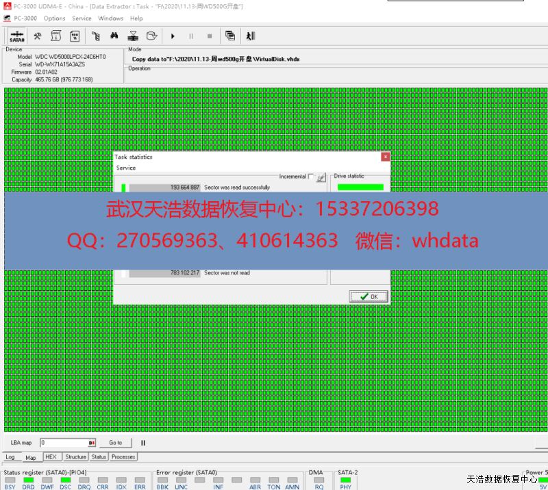 解决方案:收到硬盘后,我们在无尘环境更换兼容的磁头,再接到专业数据恢复工具上,通电正常认盘,DE镜像,成功恢复客户硬盘内几乎全部数据