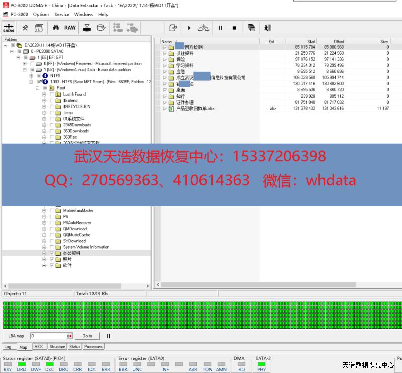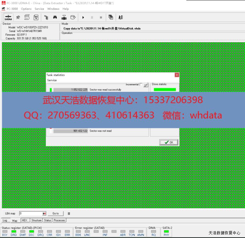 解决方案:收到硬盘后,我们在无尘环境更换兼容磁头,更换兼容的SATA无锁电路板,接到专业数据恢复工具PC3000 UDMA EXPRESS上,通电硬盘正常认盘,DE镜像,成功恢复客户硬盘内几乎全部数据!