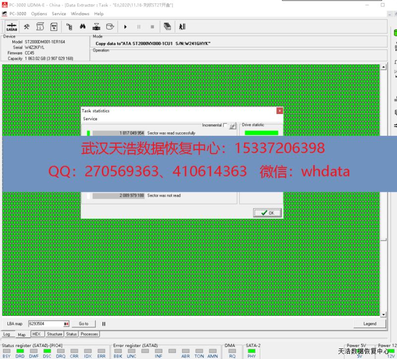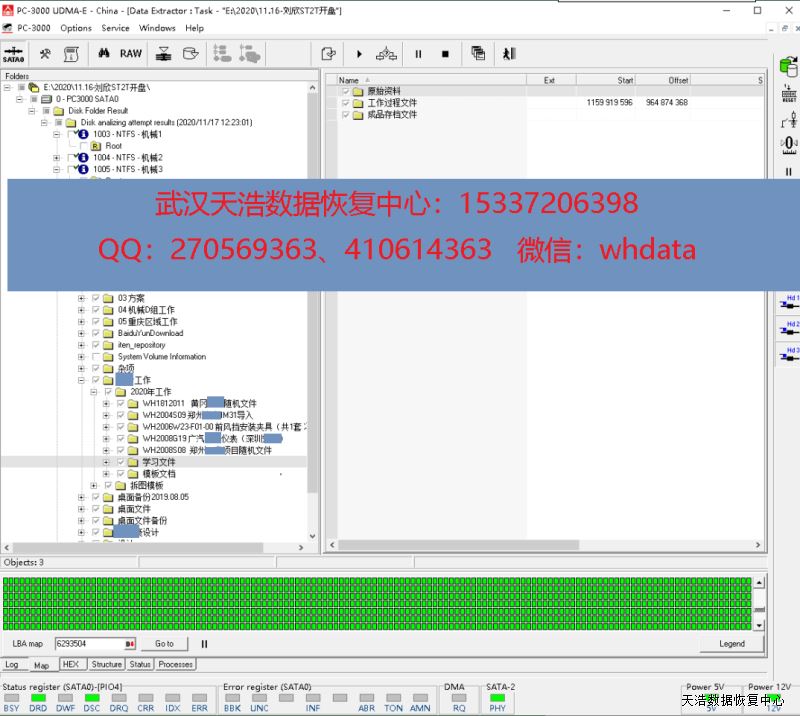 解决方案:收到硬盘后,我们在无尘环境拆开硬盘,发现盘片0面划伤,这种盘1头固件不完整,不能正常引导,于是接到数据恢复工具PC-3000 UDMA Express上读出原始ROM,再通过希捷F3热交换技术处理后,DE镜像,成功恢复客户硬盘内大部分数据。