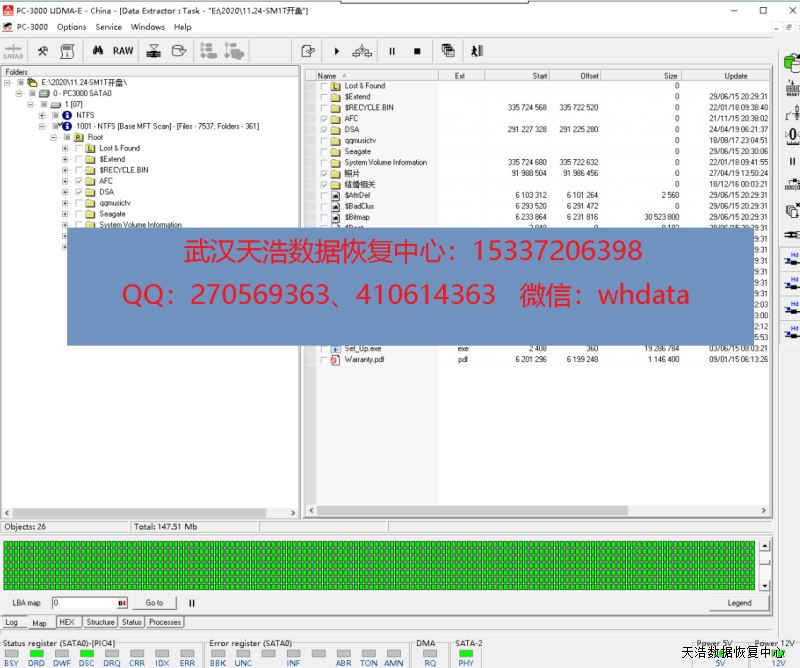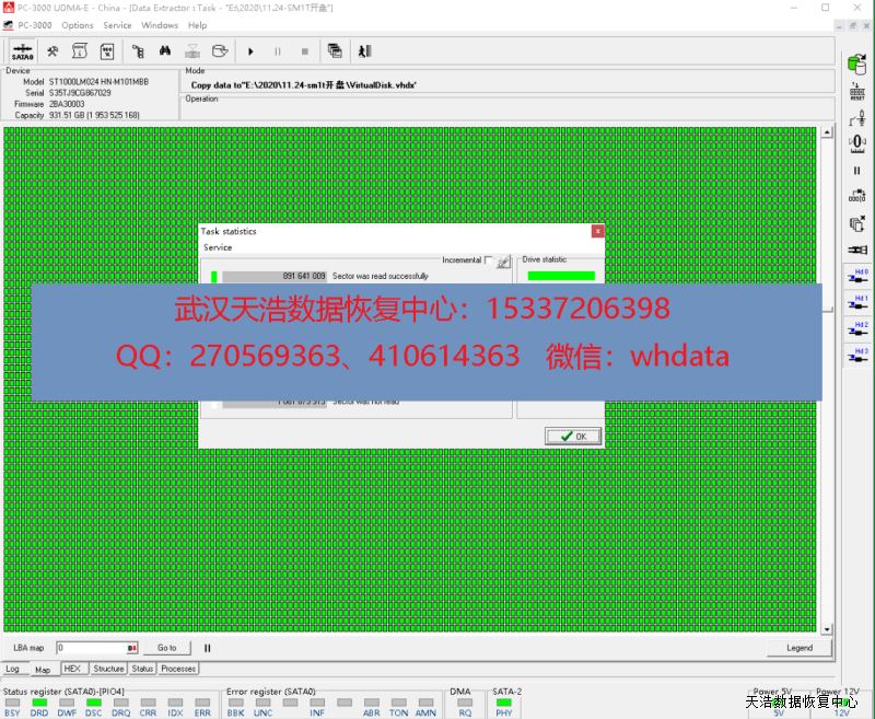解决方案:收到硬盘后,我们在无尘环境更换兼容的磁头,再接到专业数据恢复工具PC-3000 UDMA Express上,通电硬盘正常认盘,DE分头镜像,成功恢复硬盘内几乎全部数据!