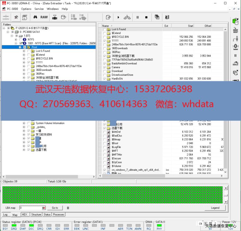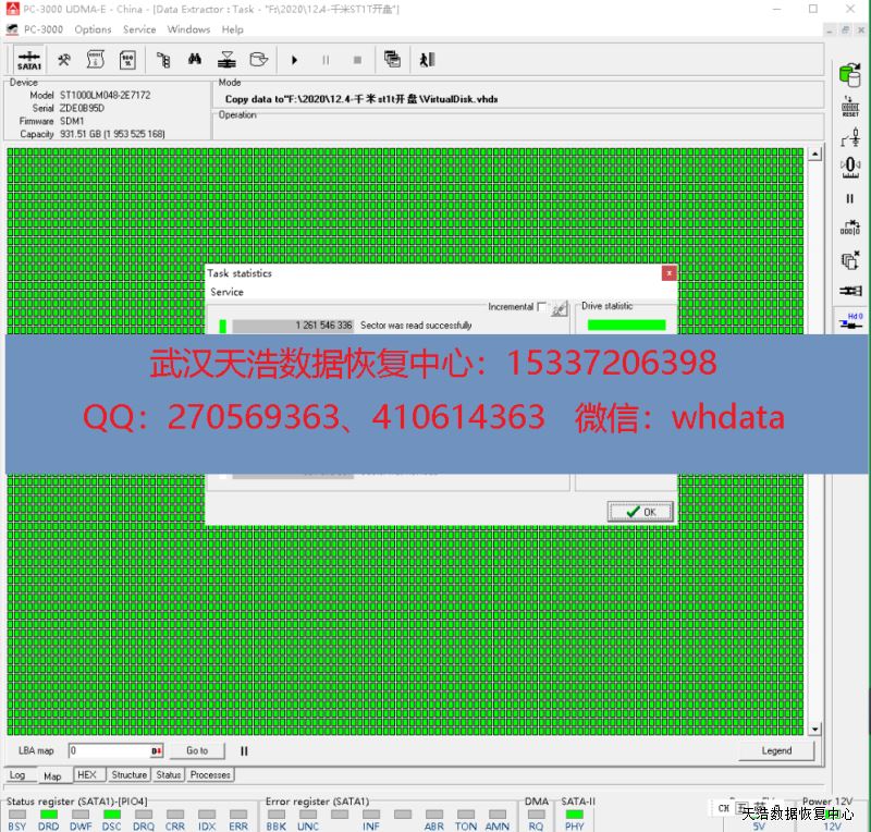 解决方案:收到硬盘后,我们在无尘环境更换兼容的磁头,再接到专业数据恢复工具PC-3000 UDMA Express上,通电硬盘正常认盘,DE分头镜像,成功恢复硬盘内几乎全部数据!