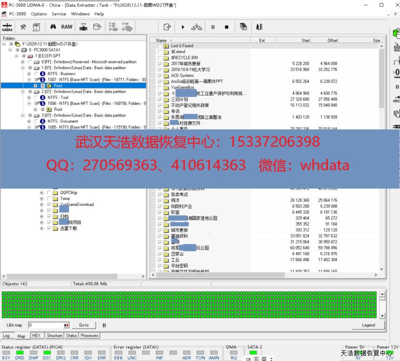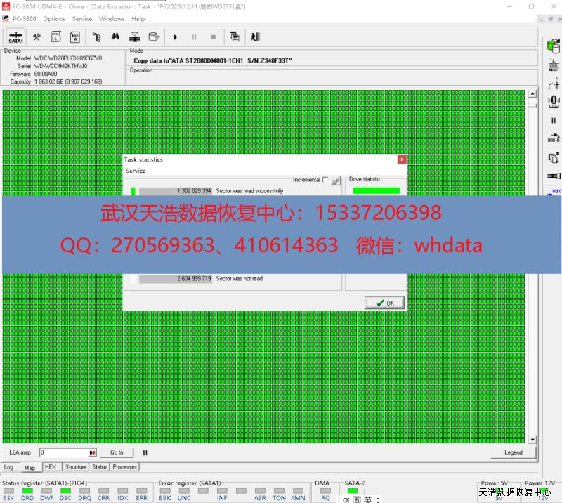 解决方案:收到硬盘后,我们在无尘环境更换兼容的磁头,再接到专业数据恢复工具PC3000 UDMA Express上,通电硬盘正常认盘,DE镜像,成功恢复硬盘内客户公司绝大部分数据!