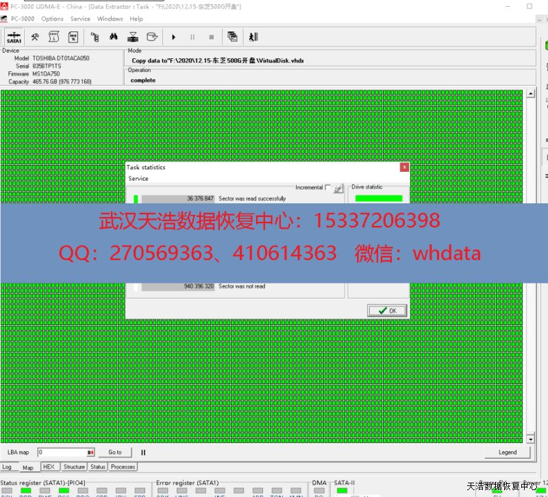 注:东芝这种台式机硬盘,很多不能读盘的都是磁头问题,而且更换好磁头后,数据基本都能完整恢复。